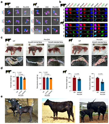 建立“类精子”表观修饰策略:当牛羊haSCs直接注射到卵母细胞(iCHI)替代精子后,雌性原核中组蛋白H3K4/K9/K27me3修饰异位表达,成为重构胚胎发育的“致命障碍”。团队先尝试过表达去甲基化酶KDM5B/4D/6A,但未能纠正修饰异常反而加剧了haSCs二倍化;最终通过瞬时表达鱼精蛋白(Prm1)策略,诱导haSCs细胞核浓缩为“类精子”结构,在细胞阶段替换“挤出”冗余甲基化修饰,成功获得了高质量Pro-iCHI重构胚胎,并获得健康可育活体牛(出生率14.3%),这一方案首次解决了单倍体重构胚胎发育难题,使囊胚形成率提升至体外受精胚胎水平,为后续基因编辑活体制备扫清了障碍。