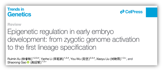 近日,同济大学生命科学与技术学院高绍荣/刘晓雨教授团队在《细胞》系列综述期刊《遗传学趋势》(Trends in Genetics)上受邀发表题为“Epigenetic regulation in early embryo development: from zygotic genome activation to the first lineage specification”的综述。该综述系统梳理了哺乳动物着床前胚胎发育过程中表观遗传重编程的动态全景,重点阐述了DNA甲基化、组蛋白修饰、染色质高级结构、转座元件(TEs)和RNA修饰的调控作用,并深入探讨了体细胞核移植(SCNT,克隆技术)和辅助生殖技术(ART)中表观重编程异常所引发的胚胎发育障碍及其临床意义,为理解生命起源、提升生殖医学效率和开发新型治疗策略提供了重要理论框架。