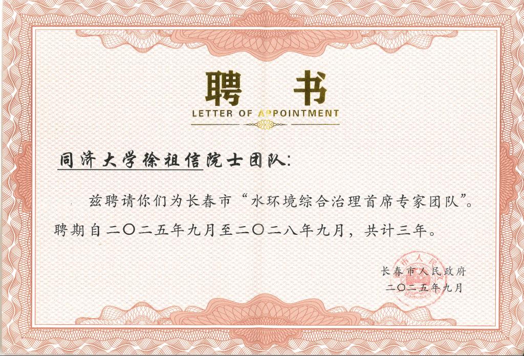 顾刚高度肯定了徐祖信院士团队的专业精神与科技贡献,表示团队的研究成果为长春筑牢供水安全防线提供了重要科技支撑。会议现场,长春市常务副市长吴波代表市政府,向徐祖信院士团队正式颁发长春市“水环境综合治理首席专家团队”聘书,标志着双方在水环境综合治理领域的深度合作正式落地。