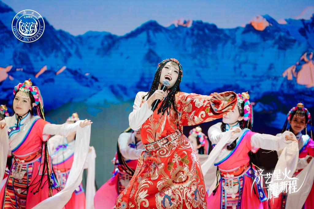 晚会正式启幕前,“同心律动”预热环节率先点燃全场热情。在“声浪领航员”的带领下,现场师生以歌曲接力的形式互动,让青春旋律在剧场内久久回荡,为“美育第一课”提前注入活力。“济忆·拾光追梦”“绽放·辉映星河”“征途·踏浪行歌”三个篇章层层递进,串联起十余个多元节目。第一篇章以“传承与启航”为核心,在学生音乐剧团带来的《歌舞青春》中拉开帷幕,学生舞蹈团《觉醒年代》《光亮》、学生合唱团《天下》及C4Family街舞协会等社团联合呈现的《“济”刻电波》串烧,尽显青春张力、历史厚重与校园文化丰富性。第二篇章聚焦“精神传承与青春表达”,《国家宝藏》团队编排的舞台剧《同济宝藏之同济号》、串烧《济给你的一首歌》、情景朗诵《四海同舟,青春向党》,兼具思想深度与情感共鸣,传递使命感。第三篇章围绕“奋进与展望”,学生民乐团《嚯哈·世间始终你好》、民族学生艺术团《再唱山歌给党听》、学生合唱团及各学院合唱基地联合呈现的《灯火里的中国》,尽显文化自信与团结力量,将晚会气氛推向高潮。
