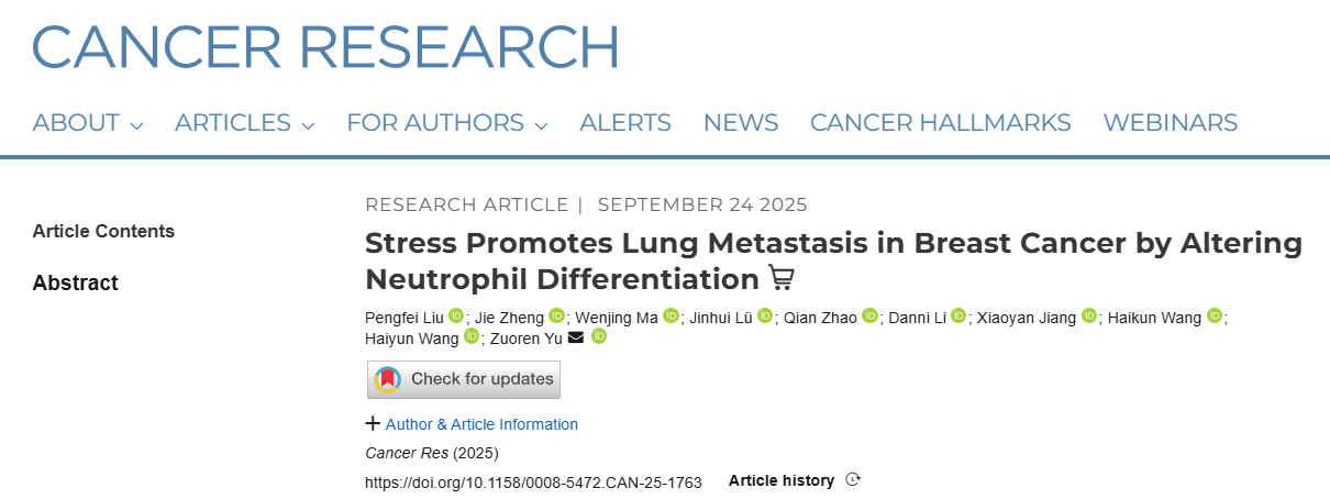 同济大学俞作仁/王海芸团队研究揭示精神压力重塑肺微环境中性粒细胞促进乳腺癌肺转移,成果发表于《癌症研究》