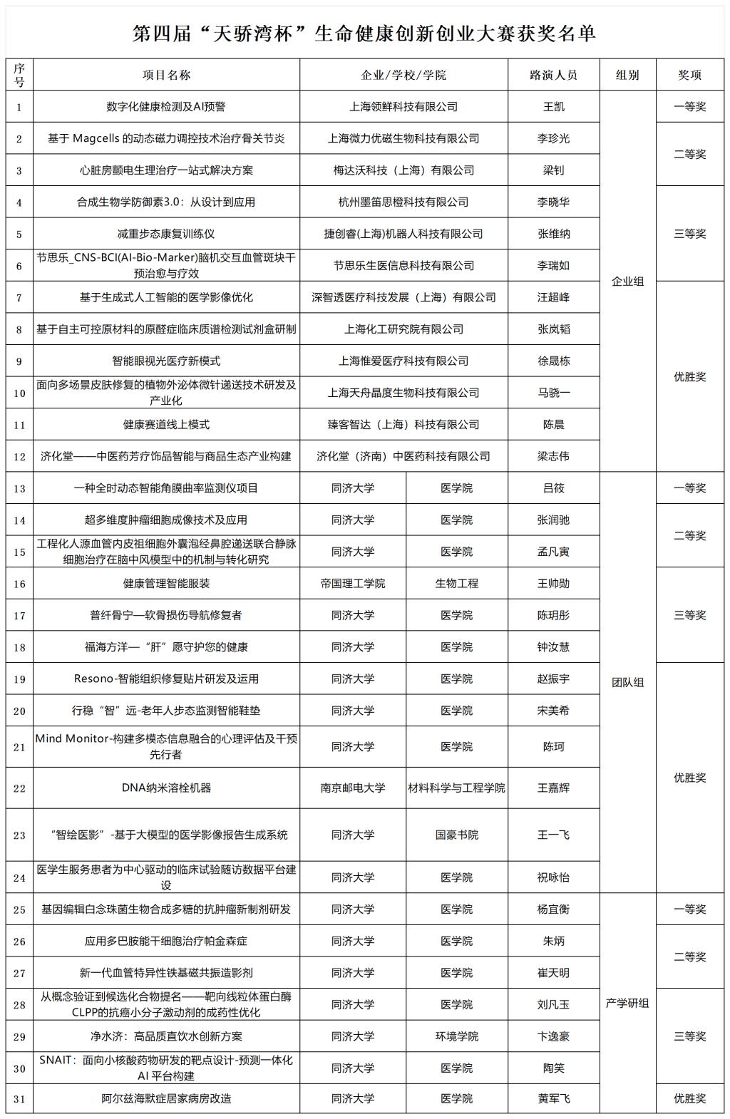 大赛主题为“同医共创 产业共生”,聚焦生命健康领域及以此为应用场景的数智化创新方向,并传承前三届赛事积累的经验与初心,首次引入“产学研组”,旨在以大赛为纽带,构建起高校科研成果、企业需求与园区资源之间的闭环体系,推动同济创新成果高效转化与应用,聚力打造环同济数智健康产业带。本届大赛自启动以来,受到社会各界广泛关注,吸引了众多生命健康领域的创业企业和团队踊跃参与,共有90多个项目报名参赛。经过三轮的激烈角逐,大赛共有获奖项目31个,其中企业组、团队组和产学研组一等奖各1个、二等奖各2个、三等奖各3个,优胜奖共计13个。