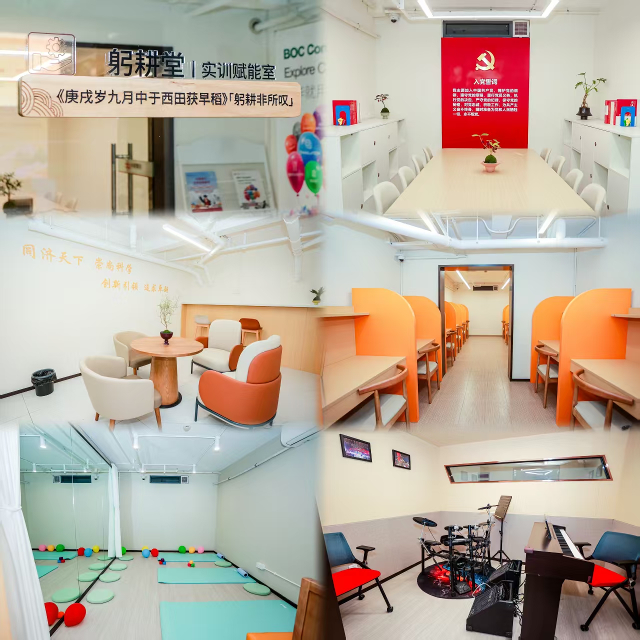 启动仪式结束后,与会人员共同参观了同济大学·中银慧谷“一站式”学生社区协同育人中心。该学生社区协同育人中心以“慧谷芳洲”为总命名——取“人生瀚海中的安定绿洲”之意,寓意这里将成为滋养心灵、启迪智慧的成长沃土。社区内的每一个空间,都浸润着同济的文化基因与育人巧思:“立心厅”党建活动室,以“为天地立心”的理想信念,为学生引领方向;“汇川斋”多维自习室,以“不积小流,无以成江海”的治学精神,引导学生厚积薄发;“和鸣舫”音乐练习室,借“鼓瑟鼓琴,和乐且湛”的和谐意境,培育美育素养;“躬耕堂”作为实训活动室,践行“躬耕非所叹”的实践精神……功能房精准对接德智体美劳“五育”育人需求,每一处设计都彰显着“以学生为中心”的建设理念。