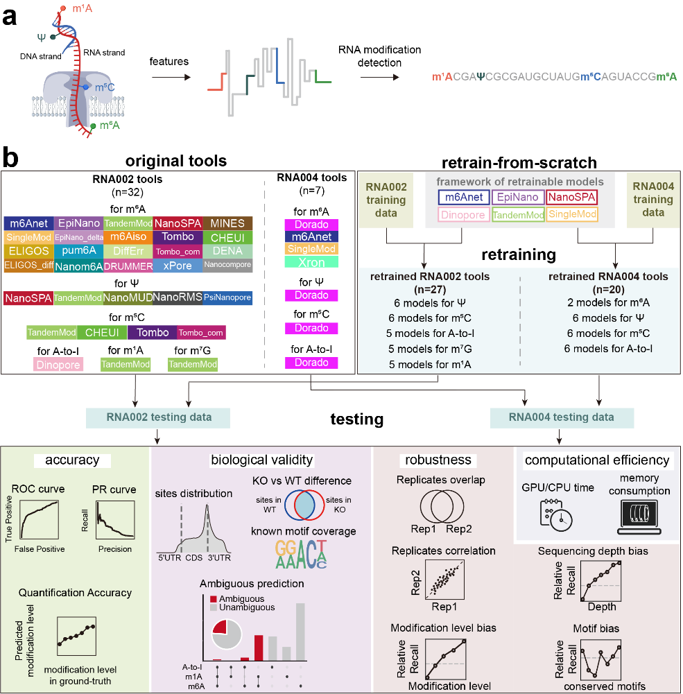 RNA修饰是“表观转录组学”的核心研究对象,广泛参与RNA稳定性、剪接和翻译等生物学过程,精准调控RNA命运。牛津纳米孔技术(ONT)推出了直接RNA测序方案(DRS),无需扩增直接对RNA分子进行测序,通过捕捉其穿过纳米孔时产生的电信号差异,并借助计算建模区分不同修饰类型,从而实现在单次实验中同时检测多种RNA修饰。随着该技术的应用,大量用于解析DRS数据中修饰信号的算法不断涌现。然而,这些算法的性能究竟如何?能否准确区分不同的修饰类型?面对DRS技术的持续迭代,计算工具应如何适应?这些问题始终悬而未决。