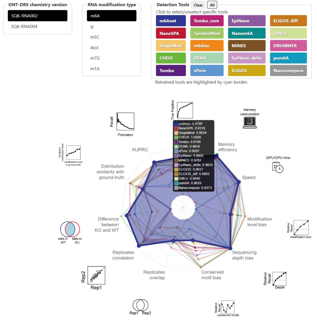 为促进领域发展,作者发布了全面的算法性能总结与在线资源平台NaRMBench,将每个工具的12项关键性能指标整合为交互式雷达图,方便用户根据需求进行选择与比较。该工作不仅为实验学者筛选适用分析工具提供了实用依据,也为算法开发指明了优化方向,为完善RNA修饰检测方法学奠定了重要的基准资源与权威指导。