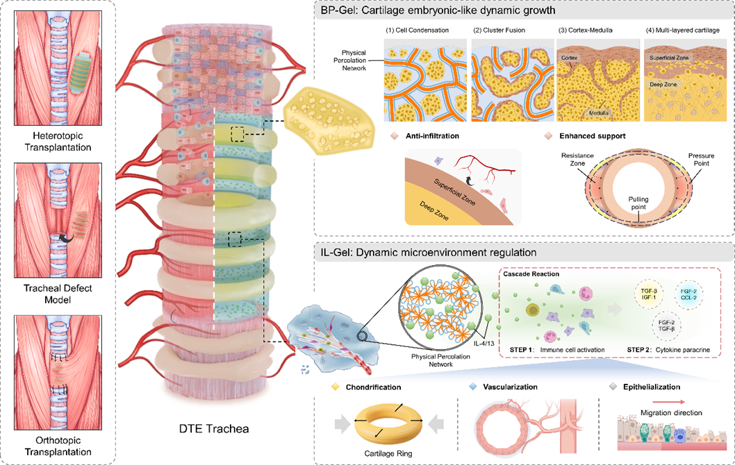 在软骨构建过程中,研究团队观察到软骨细胞在BP-Gel中可自发迁移、聚集并发生融合,形成类似胚胎期软骨发生的发育过程。与传统化学交联水凝胶中细胞长期分散的状态不同,该动态体系逐步诱导形成具有皮质-髓质层次特征的工程化软骨,其组织学结构和力学性能更接近天然气管软骨,为气管长期稳定提供了关键基础。在此基础上,研究进一步整合了细胞因子缓释策略,在软骨环之间引入负载IL-4/IL-13的水凝胶体系,通过持续调控免疫微环境,诱导巨噬细胞向促修复表型转化,从而在不破坏软骨表型的前提下促进血管生成并加速气道上皮成熟。该策略实现了对气管再生过程中空间与时间维度的精细调控。