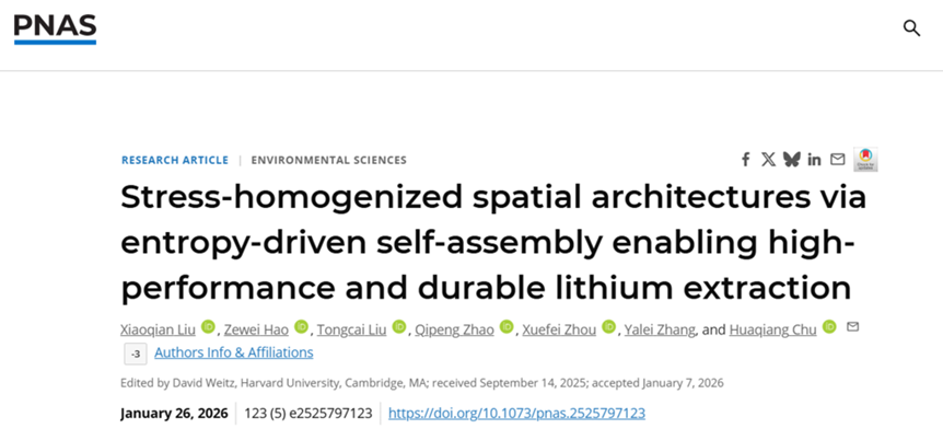 环境科学与工程学院张亚雷、褚华强团队研究熵驱动自组装构筑应力均质化架构,实现高效持久锂提取,成果发表于《美国科学院院刊》