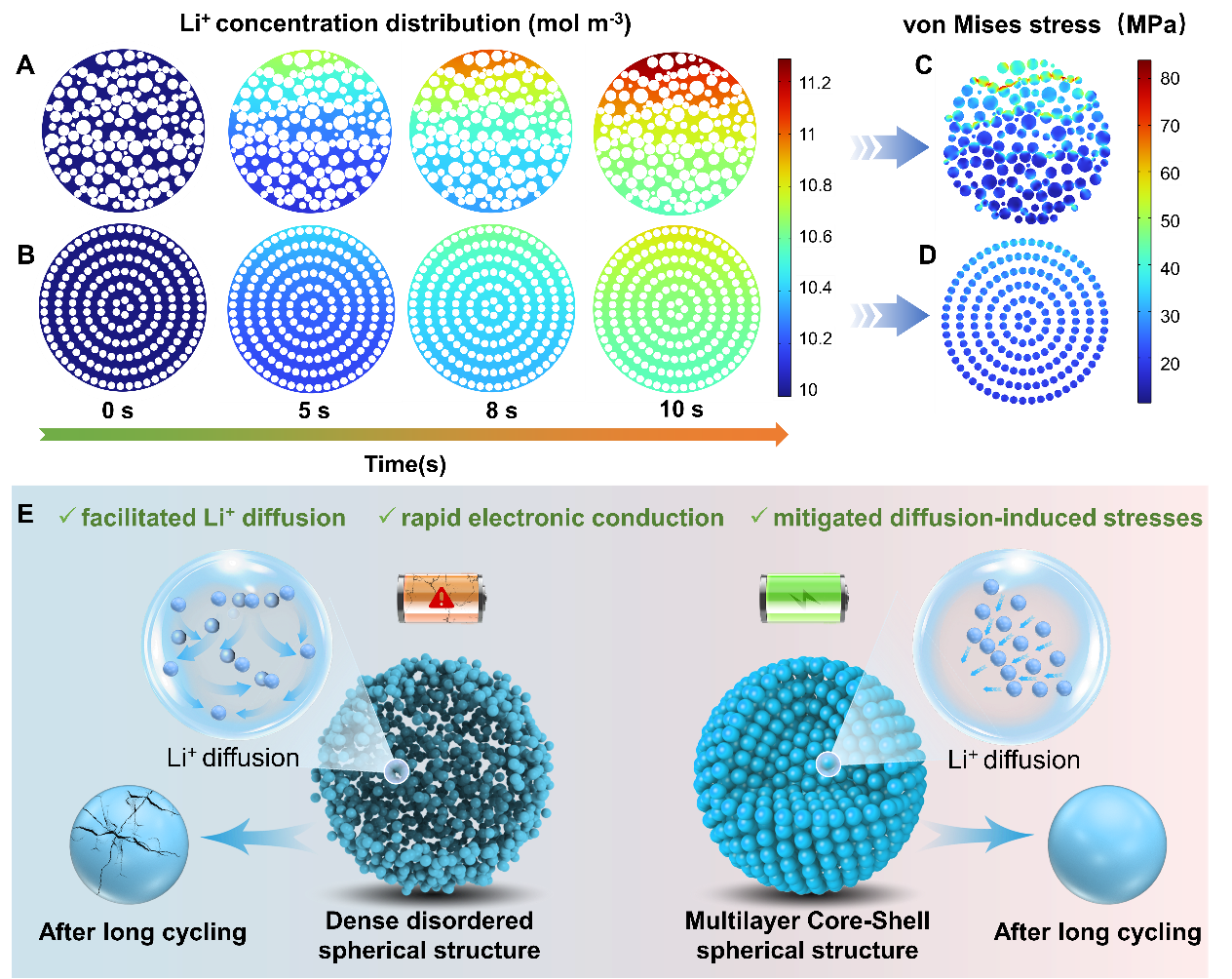 研究构建有序层间通道确保了锂离子的均匀快速传输与内部应力的有效重分布。有限元模拟(FEM)与密度泛函理论(DFT)计算揭示,相比无序致密结构,多层核壳结构Li⁺浓度分布更加均匀,最大von Mises应力降低了48%,有效缓解了局部应力集中。