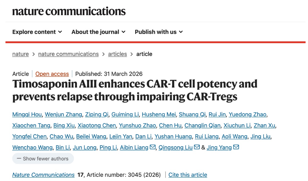 3月31日,同济大学生命科学与技术学院杨静研究员、附属同济医院梁爱斌教授,联合中国科学院合肥物质科学研究院刘青松研究员团队在《自然·通讯》(Nature Communications)上发表题为“Timosaponin AIII enhances CAR-T cell potency and prevents relapse through impairing CAR-Tregs”的研究成果,首次发现源自中药知母的天然产物知母皂苷AIII(TAIII)能够精准清除CAR-Tregs、显著增强CAR-T疗法的抗肿瘤效果并防止复发。