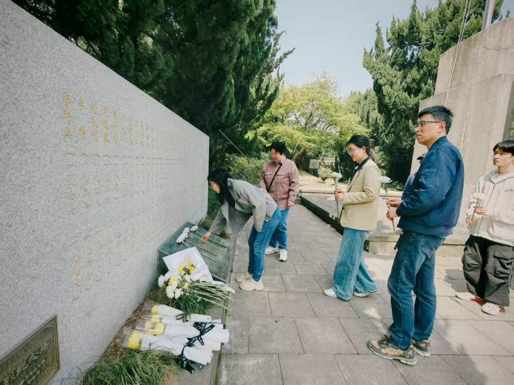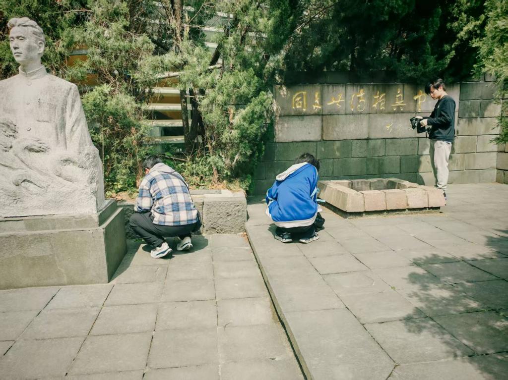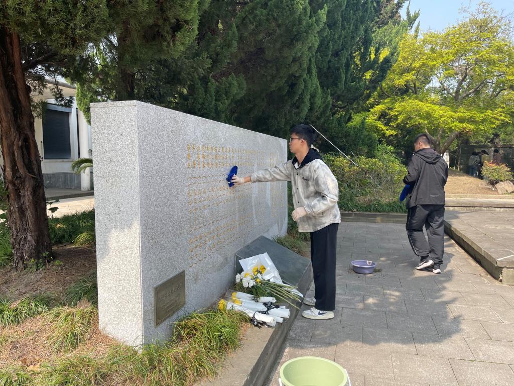 4月2日,四平路校区一·二九纪念园内松柏含翠,庄严肃穆,40余名师生代表在工作人员的细致讲解与引导下,迅速投入到劳动实践中。有的手持软布,蘸取清水,小心翼翼地擦拭纪念碑的每一处纹路,让镌刻在纪念碑上的英烈事迹愈发清晰可辨;有的握着小铲子,弯腰俯身,仔细清理碑座周边的杂草,不放过任何一处卫生死角;有的手提水桶,认真冲洗路面的灰尘与落叶,让整个纪念园在劳动中焕发洁净肃穆的风采。劳动结束后,全体师生在纪念碑前整齐伫立,低头默哀,向革命先烈致以最崇高的敬意,随后有序走上前,将手中的白色菊花轻轻放在碑前,以朴素而真挚的方式缅怀先烈、寄托哀思。