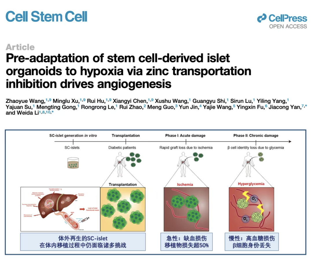 4月2日,同济大学李维达教授团队与云南省第一人民医院晏家骢研究员团队在《细胞·干细胞》(Cell Stem Cell)上发表研究论文,提出了一种用于优化干细胞来源胰岛类器官(SC-islets)移植效果的新型预处理策略。