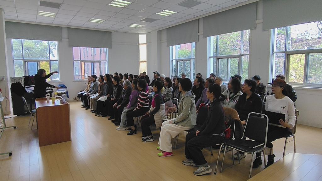 3月30日,在沪西校区霜红庐老年活动中心,有多所老年大学教学经验的赵玉珍老师,从呼吸方法、发声位置入手,带领学员练习经典老歌《我和我的祖国》,传授他们正确的歌唱方法,解读歌曲内涵,把握不同风格的声乐作品。
