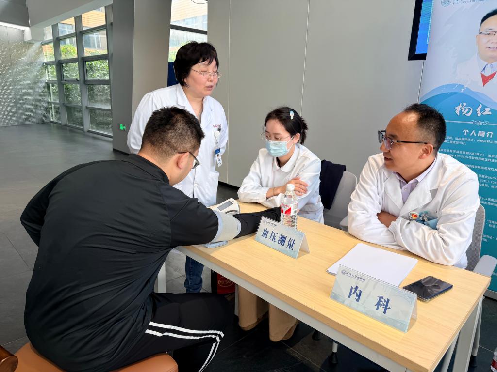 在免费便民健康服务区,师生们早早前来排队等候、积极参与体验,问诊、检测、咨询的队伍全程有序绵延。校医院医护人员为到场师生提供血压测量、血糖检测等基础健康筛查服务,操作专业细致,全程高效有序,让师生在午休时段就能快速完成基础健康检查,直观了解自身健康基础状况。