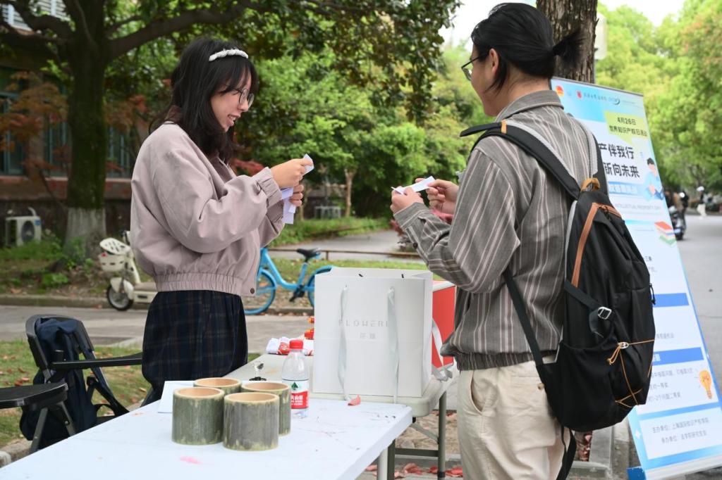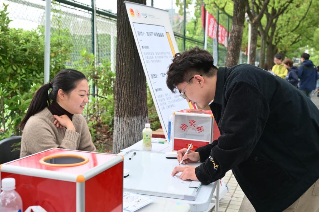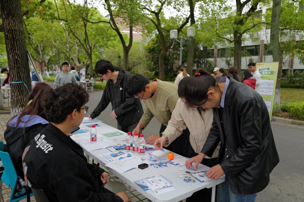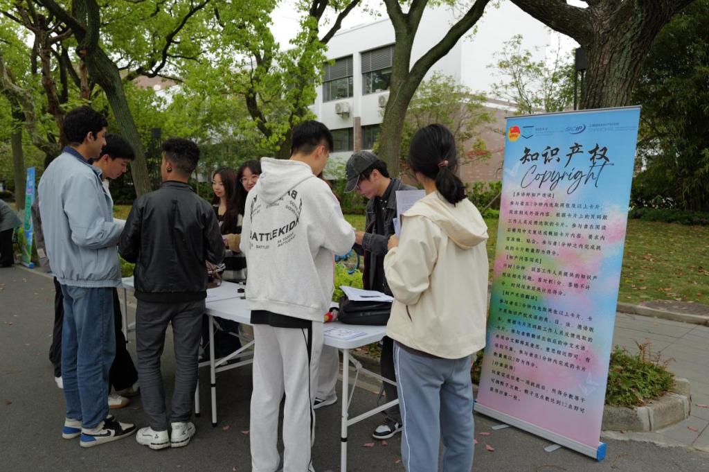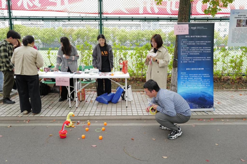 随后,师生们移步嘉年华展区,参观并体验各学院特色互动摊位。本次嘉年华延续经典集章的形式,现场设置16个特色互动摊位,将知产知识融入游戏闯关,让师生在沉浸式互动中学习知产规则、强化保护意识。上海国际知识产权学院从专业知识出发,设置3个摊位,通过正版辨识、飞镖闯关、链珠DIY等形式让参与者直观识别侵权行为,筑牢版权与商标保护意识,读懂知识产权从研发到转化的全链条。复旦大学法学院通过投壶、找茬、配对等形式,聚焦AI生成内容侵权边界,强化案例与法条结合能力,提升数字时代知产风险防范意识。上海交通大学凯原法学院设置连续答题闯关、近似商标比对辨别两项游戏,提升参与者商标近似判断、基础知产规则运用能力。华东师范大学法学院设置30秒内辨识同品类商标的游戏,普及商标多元化保护规则,让参与者理解商标不仅限于名称,同样覆盖声音、形状、包装等多重维度。上海财经大学法学院让参与者朗读知产主题绕口令、抢答版权知识题目,以轻松形式记忆版权核心概念,普及文化创意、数字内容版权保护规则。同济大学图书馆采用“图案拼图+元素识别”的趣味形式,让参与者在轻松互动中直观认识知识产权相关标识与元素,快速建立对知识产权的基础认知。同济大学研究生会用盲盒抽题作答、现场绘制商标图标的方式提升趣味性,普及生活中常见商标、版权、专利常识,拉近了知识产权与日常学习生活的距离。建筑与城市规划学院让参与者辨别真实建筑与AI生成建筑,有助于厘清数字时代建筑设计知识产权保护边界。土木工程学院设置四色问答极速闯关赛,融入土木元素和知产标识,强化智能建造与知产保护的认知。外国语学院让参与者速读复述外语知产段落、翻译与解释多语种知产术语,拓宽国际知识产权视野,助力全球化知产保护交流。法学院设置投球答题挑战,以竞技的形式深化了参与者对法条规定和侵权认定的理解。测绘与地理信息学院用全景图片定位中国地点,识别地理标志产品,普及地理标志相关知识,强化专业领域知产保护认知。国际足球学院借鉴足球VAR裁判模式,红牌和黄牌分别对应侵权和合理使用,在活动中加强参与者对知产侵权的认识与辨别能力。“果汁”知产力法律志愿服务队以“抢答—对决”的形式为主,用竞赛的方式强化知产记忆,让知识在趣味答题中深入人心。