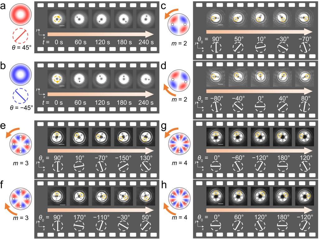 图2、通过粒子动力学对IPM的拓扑性质进行实验表征。(a,b)当拓扑荷数m=1时,θ分别为45°和−45°时,3 µm聚苯乙烯颗粒分别逆时针和顺时针旋转。(c−h)当m = 2、3、4时,2、4、6个颗粒同步旋转。旋转方向取决于θ0(φ=0°处的偏振角)的变化。