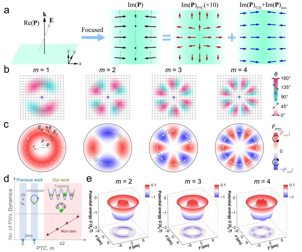 图1、IPM的物理原理、拓扑性质及其在粒子操控中的应用。(a)聚焦后的平面波产生IPM,含有三个不同分量:偏振拓扑荷数(polarization-topology charge,PTC)相关项、强度不对称相关项以及与二者同时相关的混合项;(b)不同PTC情况下的偏振分布;(c)不同PTC情况下的偏振拓扑光力(high-order polarization-topology optical force,PTOF);(d)偏振拓扑光学操控的里程碑;(e)不同PTC情况下的势阱。
