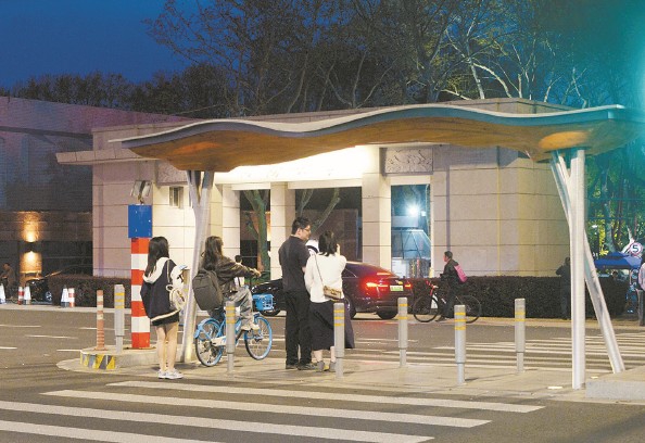 同济大学四平路校区门口的过街交通岛上,日前建起了造型独特的“过街亭”。行人过马路、等信号灯时,既能遮阳又能避雨。