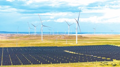新疆阿勒泰地区,由太阳能光伏板汇聚成“蓝色海洋”,由风力发电机组成“白色森林”,孕育着无限“风光”。新华社发