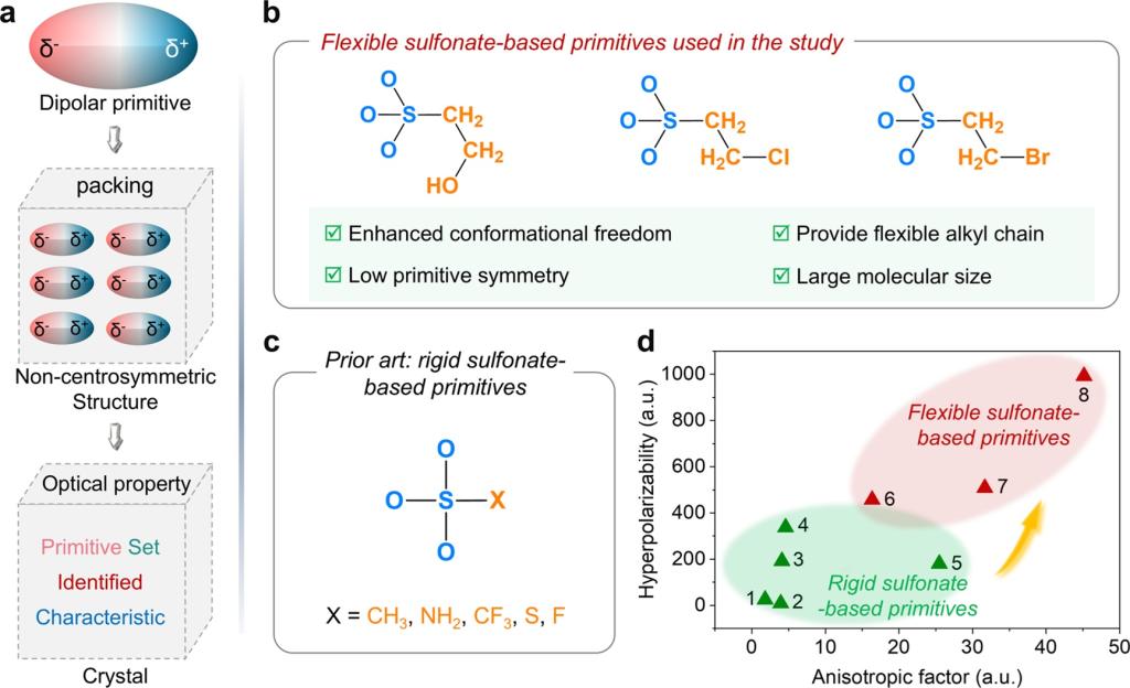 近日,欧洲科学院院士、德国国家工程院院士、同济大学化学科学与工程学院张弛教授研究团队,联合中国科学院北京理化技术研究所、澳大利亚国立大学等单位,在深紫外透明极性有机磺酸盐非线性光学晶体研究中取得重要进展。研究团队提出“连接性调控”策略,通过精准调控阴离子烷基链或抗衡阳离子,成功合成出系列高性能有机磺酸盐晶体,其中,Li [SO3(CH2)2OH]晶体成功实现了深紫外透明度与非线性光学性能的协同优化。相关成果“Unlocking Strong Second-Harmonic Generation in Deep-UV-Transparent Polar Organic Sulfonates through Connectivity Regulation” (通过连接性调控在深紫外透明极性有机磺酸盐中实现强二次谐波产生)日前以全文(Research Article)的形式发表于国际化学、材料权威学术期刊《德国应用化学》(Angewandte Chemie International Edition, 2025, e21786),并被编辑委员会遴选推荐为当期的封面文章和热点论文(HOT Paper)。