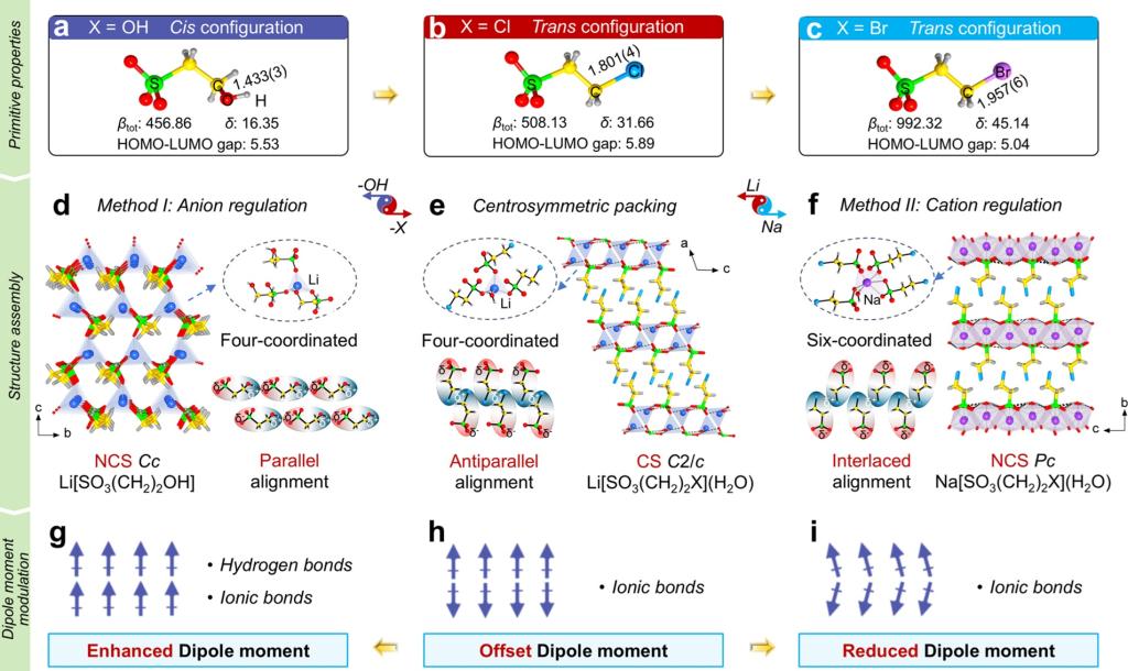 在这一研究中,针对传统有机磺酸盐晶体难以兼顾宽禁带与强二阶谐波响应的挑战,研究团队创新性地采用柔性磺酸根基元 [SO3(CH2)2X]- (X = OH, Cl, Br)作为构建单元,并通过两种路径实现结构与性能的精准优化:一是替换抗衡阳离子(Li+, Na+),以改变晶体配位环境与分子堆积方式;二是修饰阴离子烷基尾端取代基,从而调控分子间氢键作用与偶极矩排列。基于上述设计策略,研究团队成功制备了一系列新材料:母体化合物Li[SO3(CH2)2X] (X = Cl, Br), 极性化合物Na[SO3(CH2)2X] (X = Cl, Br),以及性能最优的Li [SO3(CH2)2OH]。研究发现,在Li [SO3(CH2)2OH]晶体中,[SO3(CH2)2OH]-阴离子通过氢键与离子键的协同作用形成平行排列,有效避免了偶极矩的相互抵消;而对比晶体Li[SO3(CH2)2X]和Na[SO3(CH2)2X]则分别呈现反平行和交错反平行排列。这种由连接性调控主导的结构差异,直接导致了晶体宏观光学性能的显著分化。