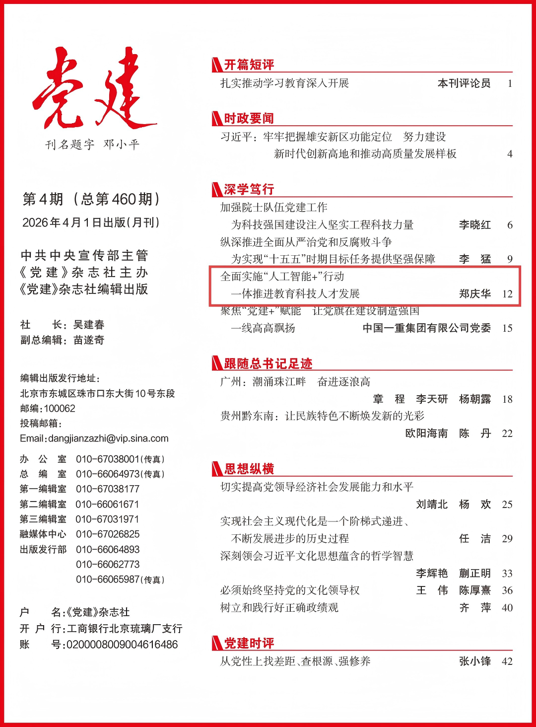4月1日出版的2026年第4期《党建》杂志刊发同济大学党委书记、中国工程院院士郑庆华的署名文章,题为《全面实施“人工智能+”行动  一体推进教育科技人才发展》。
