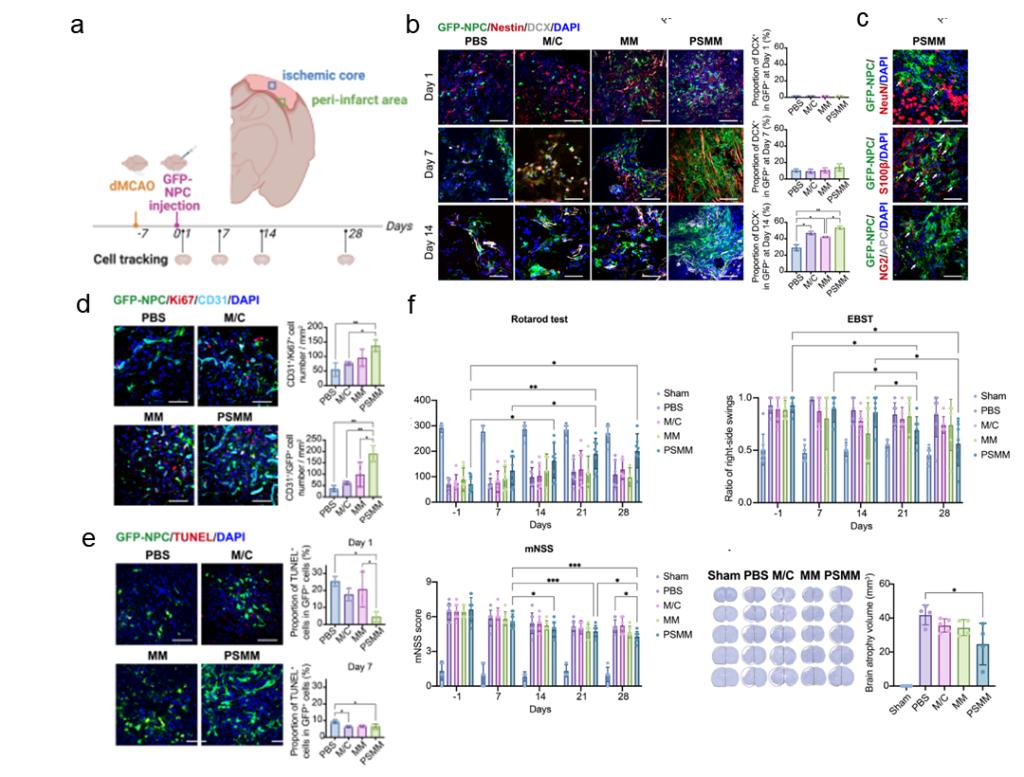最后,在缺血性卒中大鼠模型中,负载NPCs的PSMM-基质复合支架,显著提升了移植细胞的存活、增殖和神经元分化,促进了卒中核心区血管新生,减少了胶质瘢痕形成,并在28天后明显改善了神经功能恢复(图3)。