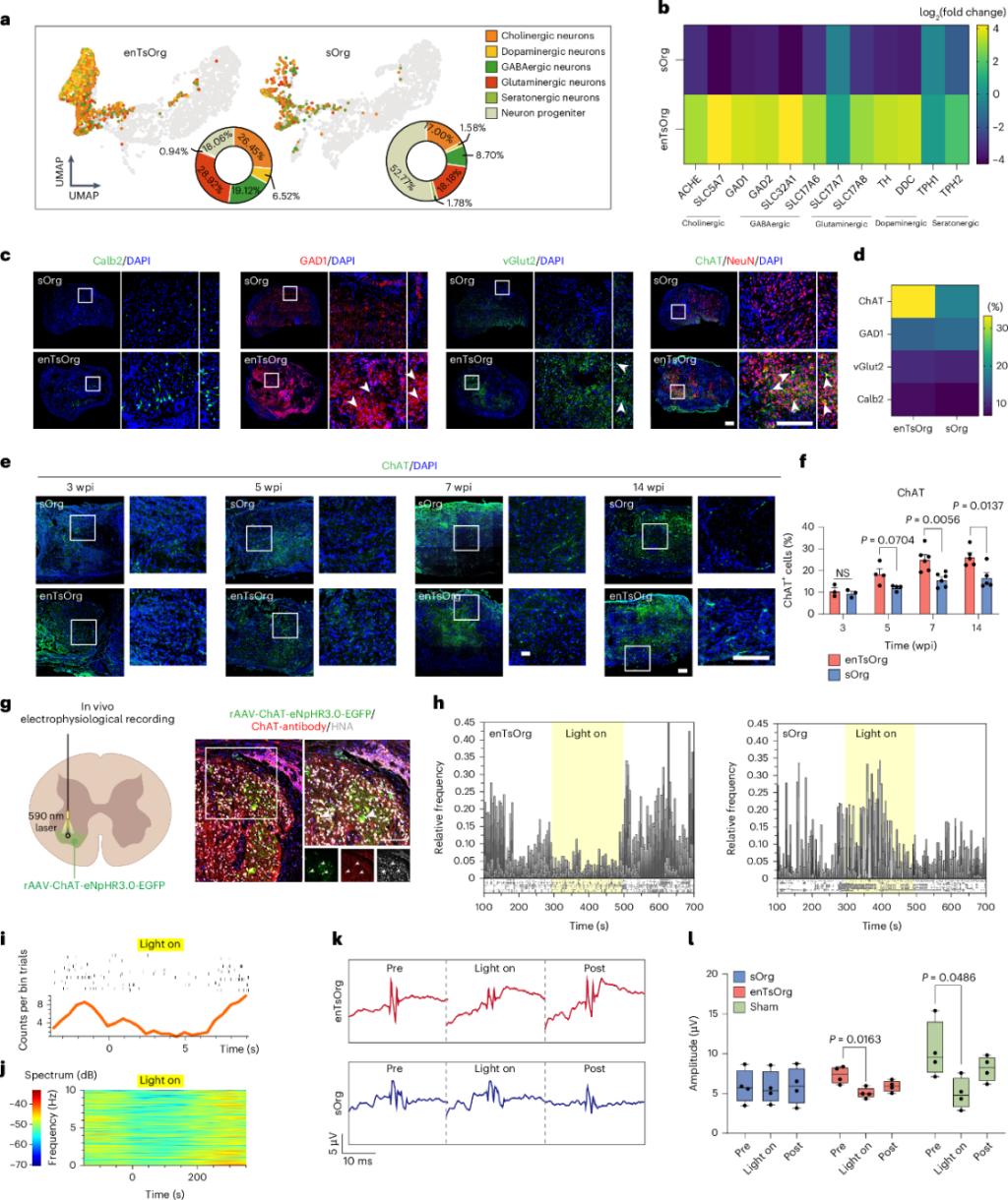 在这项研究中,研究者进一步揭示了enTsOrg在移植后形成的功能性神经元组成及其在运动控制中的关键作用。空间转录组与免疫荧光检测显示,enTsOrg移植物内含有丰富的胆碱能神经元(ChAT+)、GABA能神经元(GAD1+)、谷氨酸能神经元(vGlut2+)以及中间神经元(Calb2+),其中成熟胆碱能神经元比例较sOrg相比有明显提升。为了验证其功能,研究者在移植物中使用腺相关病毒标记ChAT+神经元,并通过光遗传学进行选择性抑制。结果表明,光抑制显著降低了运动神经元(P-PN)的放电频率,同时导致运动诱发电位(MEP)幅度下降及小鼠自主活动能力减弱。