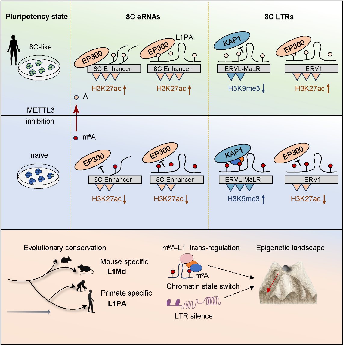 基于上述结果,研究团队提出了一个整体模型:在人类naïve胚胎干细胞中,METTL3抑制导致m⁶A水平下降,从而激活8C特异性转录本并引发染色质重塑。m⁶A修饰的丢失主要集中于eRNA与L1PA上,通过顺式调控和反式调控两种机制共同影响染色质状态及转录活性。其中,L1PA RNA作为跨层级的分子支架,能结合eRNA与LTR区域并招募表观因子:带有m⁶A的L1PA招募KAP1并限制EP300,从而维持LTR的抑制状态;当m⁶A丢失后,EP300结合增强促使ERV1获得H3K27ac,KAP1结合减少促使ERVL-MaLR失去H3K9me3,最终推动8C LTR激活和8C-like转录状态形成。
