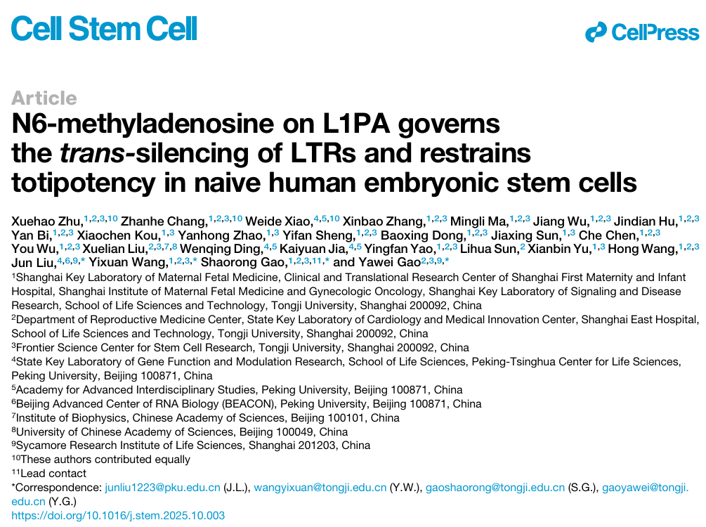 10月29日,同济大学高绍荣教授、高亚威教授、王译萱教授,北京大学刘君教授团队合作在《细胞·干细胞》(Cell Stem Cell)上发表研究论文,题为“N6-methyladenosine on L1PA Governs the Trans-silencing of LTRs and Restrains totipotency in Naïve Human Embryonic Stem Cells”。该研究揭示了m⁶A修饰通过L1PA RNA介导的跨层级转录调控网络,调控LTR沉默并限制人类胚胎干细胞的全能性,阐明了RNA修饰与染色质重塑之间的分子连接机制。