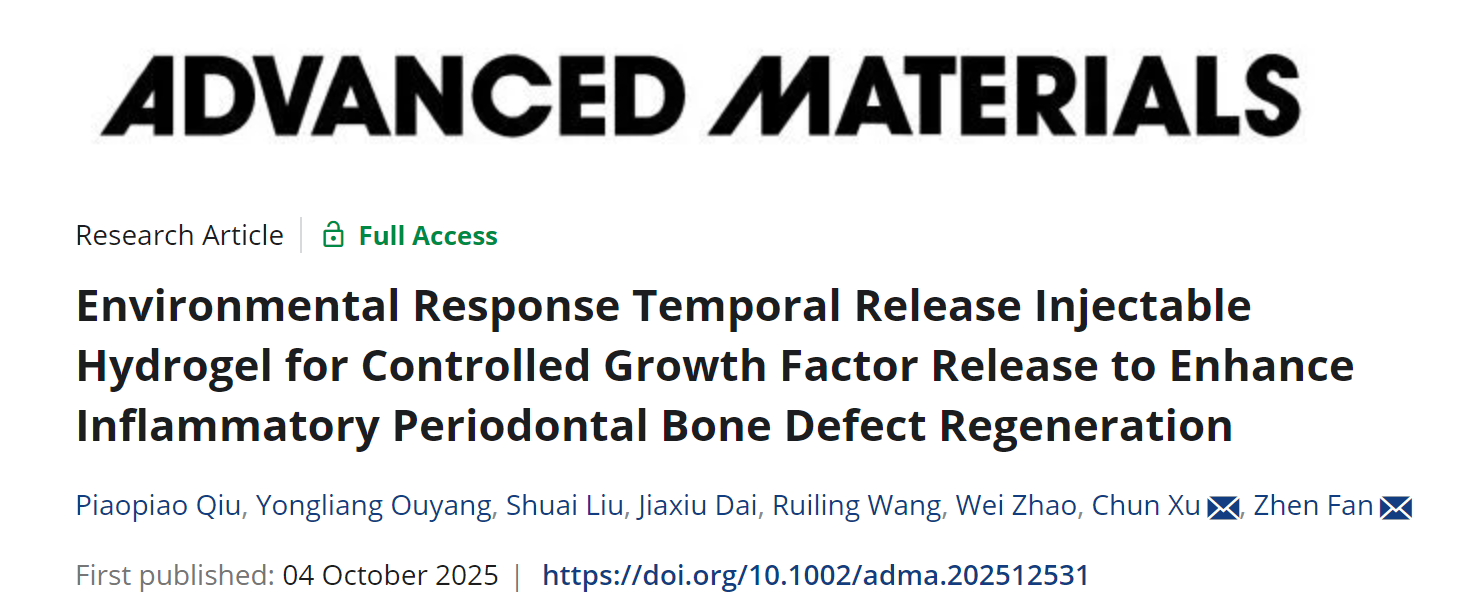 近日,口腔医学院种植科范震主任团队在国际权威杂志《先进材料》(Advanced Materials)上发表了题为“Environmental Response Temporal Release Injectable Hydrogel for Controlled Growth Factor Release to Enhance Inflammatory Periodontal Bone Defect Regeneration”的研究论文。文章内容获国家自然科学基金、上海市卫健委等项目的支持。该研究构建了一种可注射、环境响应型多功能水凝胶,为炎症性牙周的骨缺损修复提供了创新性的治疗策略与材料基础。