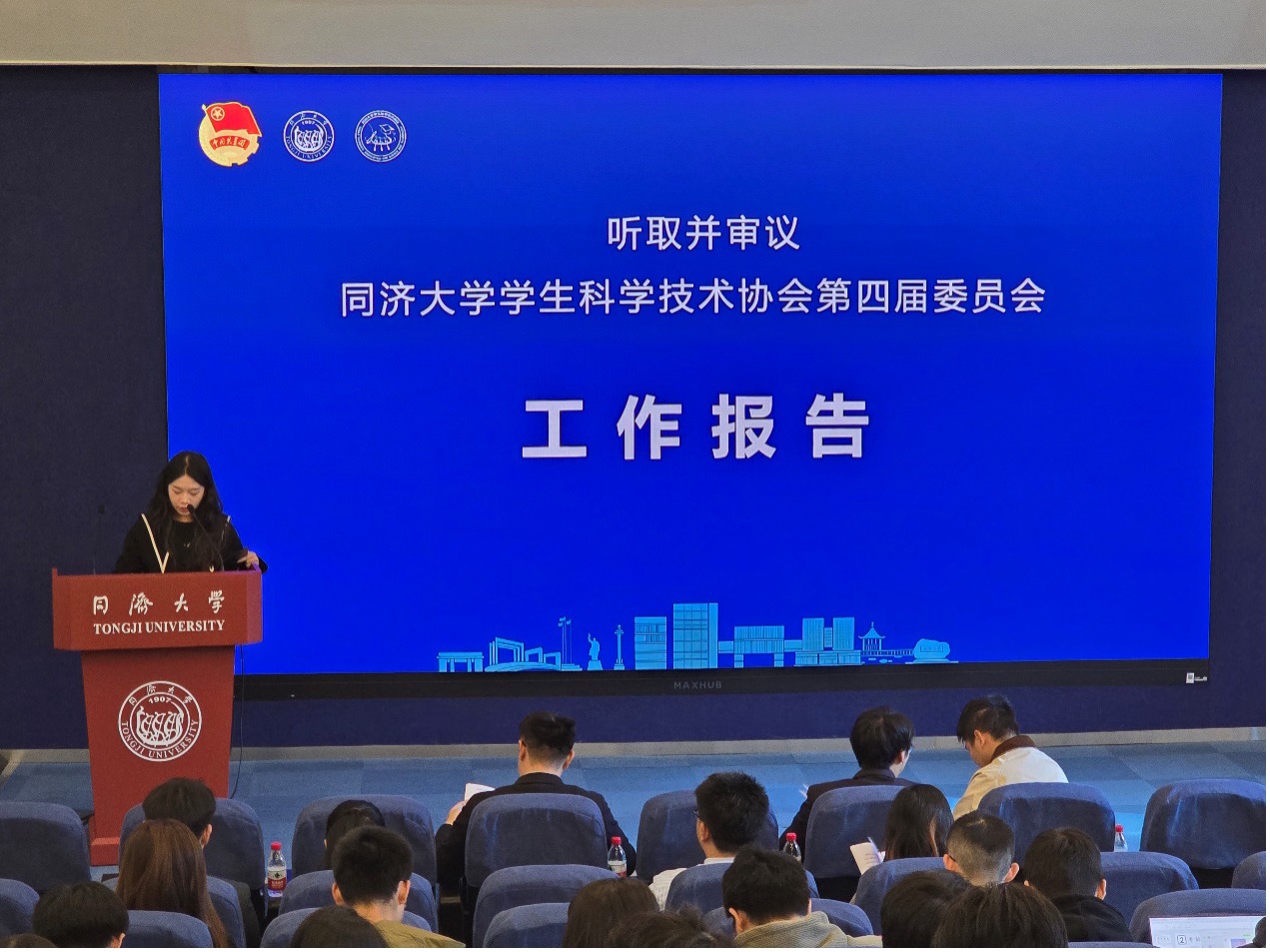 会上,同济大学科学技术研究院副院长、科学技术协会副秘书长徐荣华充分肯定了校学生科协去年一年的各项工作及成效,希望学生科协进一步营造校园科创氛围,促进科创种子蓬勃生长,继续秉持“求实创新、追求卓越”的精神,培养实践能力、建设学术诚信,持续推动学生科创工作体系建设走深走实,打造更具吸引力的创新平台。陈司瑶代表同济大学学生科学技术协会第四届委员会向大会作了题为《勇立潮头担使命 奋楫扬帆启新程 为加快建设科技强国贡献同济青春动能》的工作报告。报告全面总结了第四届学生科协的工作成果,以创新思维为笔墨,以数字媒体为载体,持续推动科创氛围营造与科创平台建设协同发展,助力打造线上线下贯通的科创互动平台,引导更多同学走进科技与梦想的交汇点。