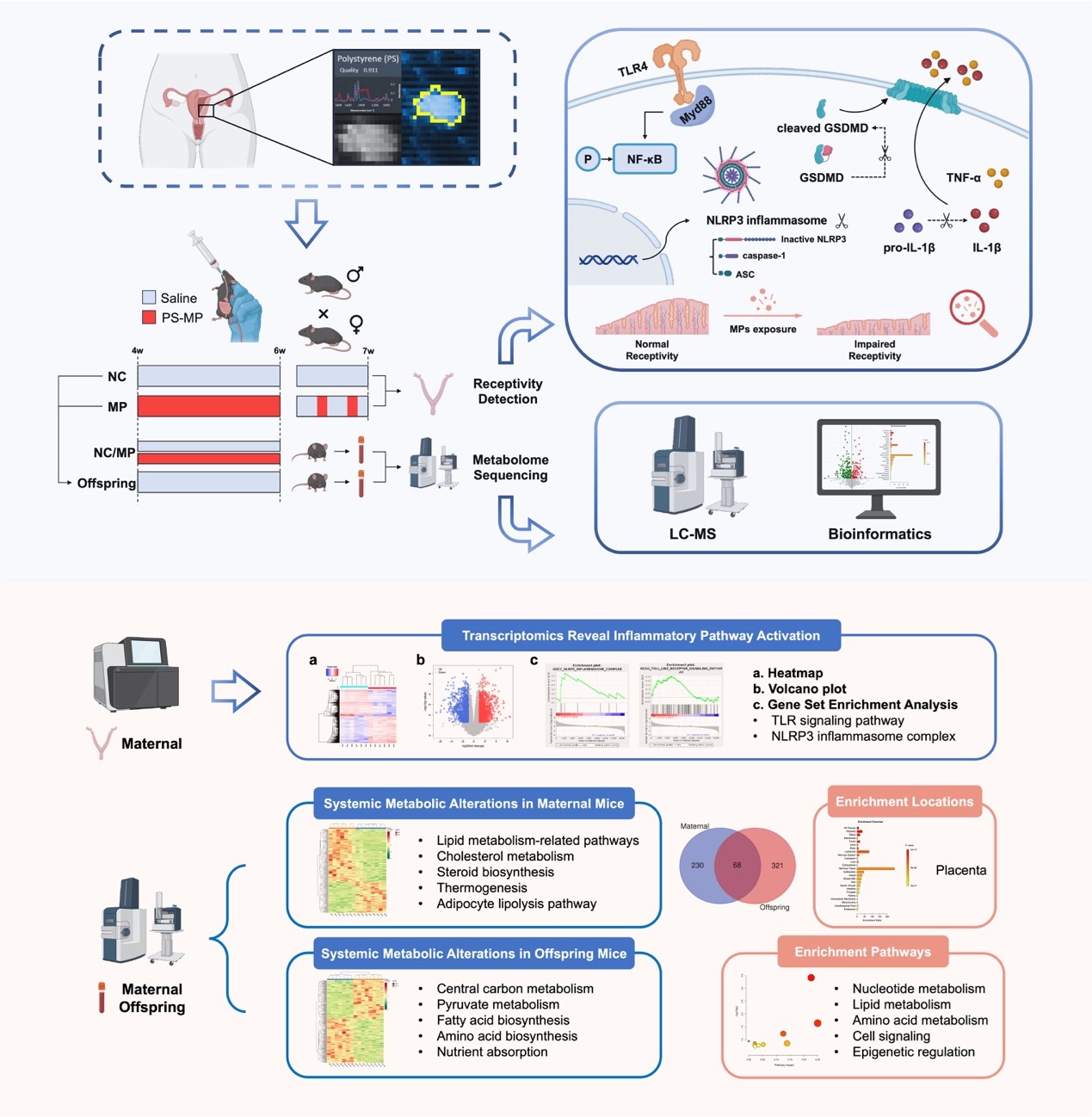 随着塑料制品的广泛应用,微塑料污染已成为全球关注的环境与健康议题。微塑料可经饮食与饮水等途径进入机体并在生物体内沉积。尽管既往研究提示其与生殖健康相关,但针对女性生育力及母婴代谢结局的机制链条仍缺乏系统阐释。该研究通过建立经口暴露的小鼠模型,综合评估微塑料暴露后子宫内膜容受性、胚胎着床率等重要生殖指标,并联合代谢层面观察,证实母婴代谢网络受到干扰。研究结果为认识微塑料可能影响女性生殖健康及后代发育提供了初步机制线索,并为相关风险评估与孕期管理提出了参考方向。