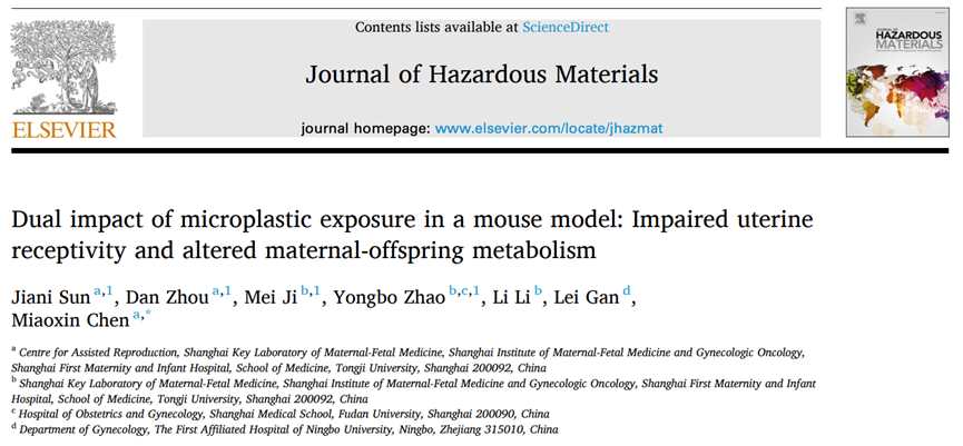 同济大学陈淼鑫团队发现微塑料损伤子宫内膜容受性并干扰母婴代谢,成果发表于《危险材料学报》