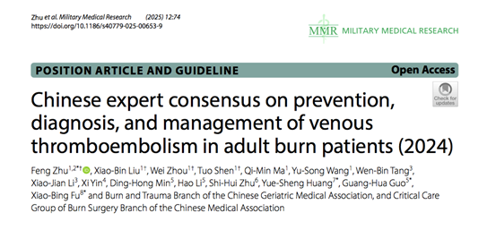 近日,《中国成人烧伤患者静脉血栓栓塞症防治专家共识(2024)》(Chinese expert consensus on prevention,diagnosis,and management of venous thromboembolism in adult burn patients)(以下简称“共识”)在《军事医学研究(英文)》(Military Medical Research)期刊上正式发布。该共识是我国首部针对烧伤患者静脉血栓栓塞症(VTE)防治的全国性临床指南,由中国老年医学学会烧创伤分会、中华医学会烧伤外科学分会重症学组牵头,同济大学附属东方医院作为主要执笔和组织单位,汇聚国内多家顶尖烧伤中心的权威专家共同制定,同济大学附属东方医院重症医学科朱峰教授、南方科技大学医学创面修复与再生医学研究所黄跃生教授、南昌大学第一附属医院烧伤科郭光华教授、解放军总医院医学创新研究部创伤修复与组织再生重点实验室付小兵院士担任共同通讯作者。