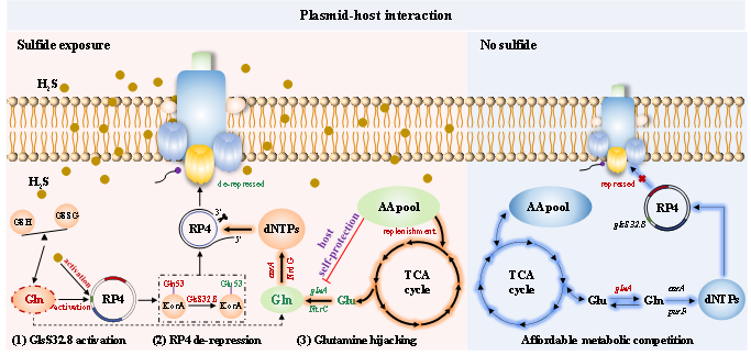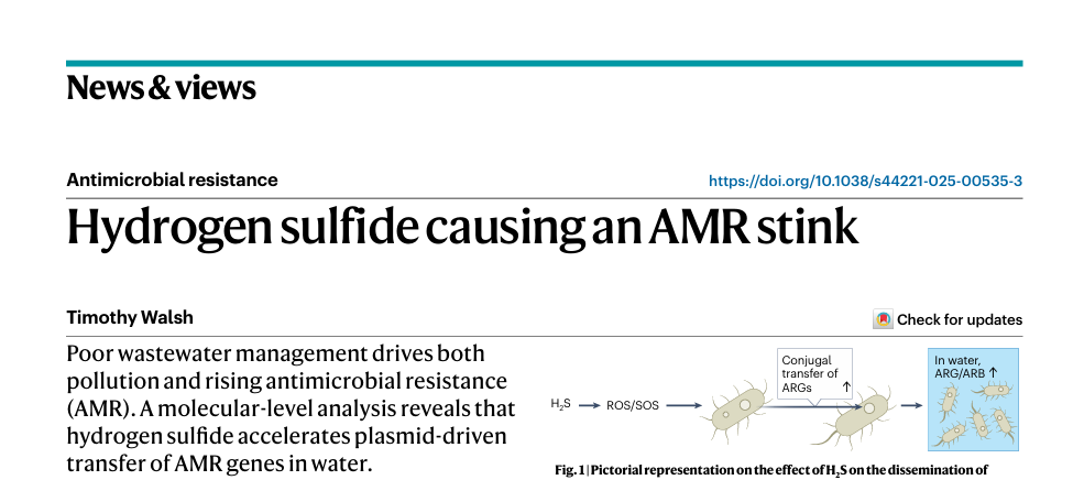 抗生素抗性基因(ARGs)通过水平基因转移进行传播,对全球健康构成重大威胁。尽管已知外源胁迫因素会促进接合转移,但内源微生物代谢物在此过程中的作用尚不明确。本研究发现在废水中普遍存在的代谢物硫化氢(H2S)是一种强效但被忽视的质粒接合促进因子,阐明了一种不同于经典SOS反应的质粒自主激活机制(图1)——RP4质粒利用其编码蛋白Upf32.8(重命名为GlsS32.8)感知细胞内谷氨酰胺水平,触发质粒去抑制,并增强从宿主窃取以谷氨酰胺为核心的代谢过程,从而在H2S环境下促进接合转移。该研究重新定义了微生物代谢物作为抗性传播关键驱动者的角色,并为理解质粒-宿主相互作用以遏制ARGs扩散提供了重要见解。欧洲科学院院士、牛津大学Timothy Walsh教授在Nature子刊《自然-水》(Nature Water)撰写题为“Hydrogen sulfide causing an AMR stink”评论(图2)。论文第一作者为同济大学环境科学与工程学院黄海宁助理教授,通讯作者为陈银广教授和郭建华教授(昆士兰大学)。