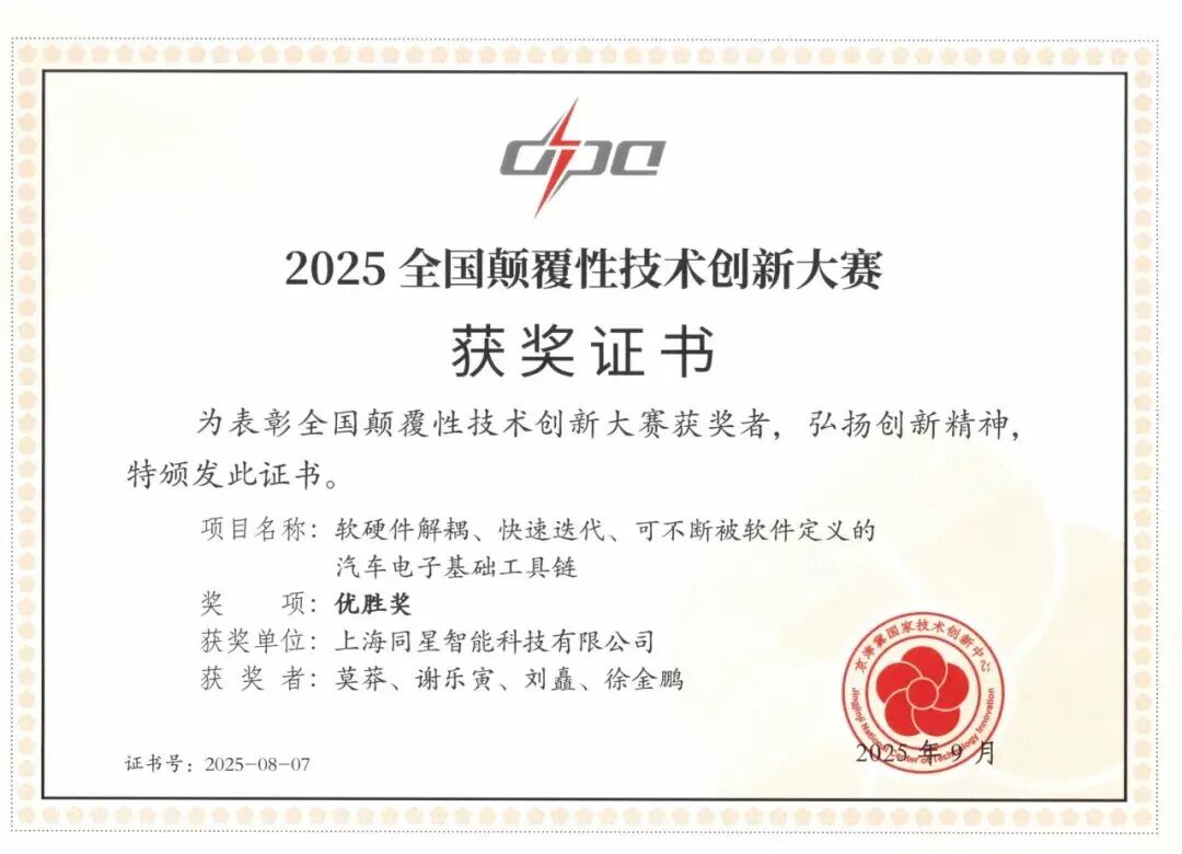 同济科技园企业同星智能TSMaster项目荣获2025全国颠覆性技术创新大赛优胜奖