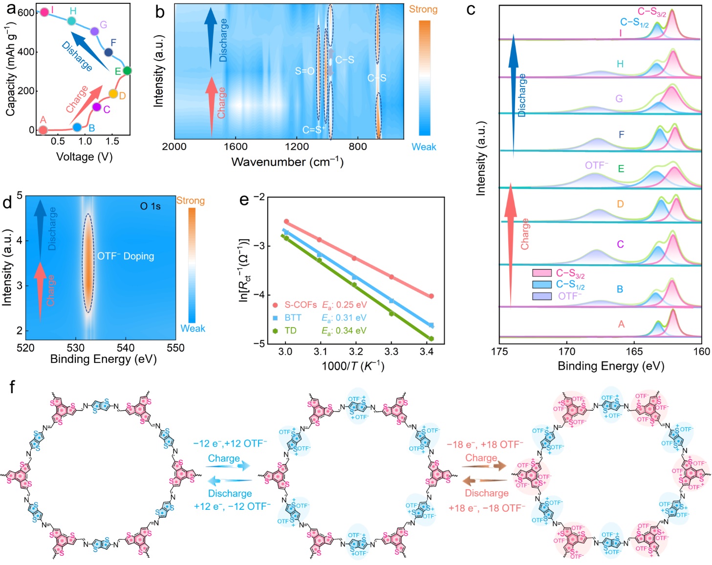 异位光谱和理论计算研究表明,二噻吩和三噻吩单元作为S-COFs正极的双p型电活性中心,与CF3SO3−阴离子电荷载体配位,引发了稳定和快速的30 e−氧化还原电荷存储过程。