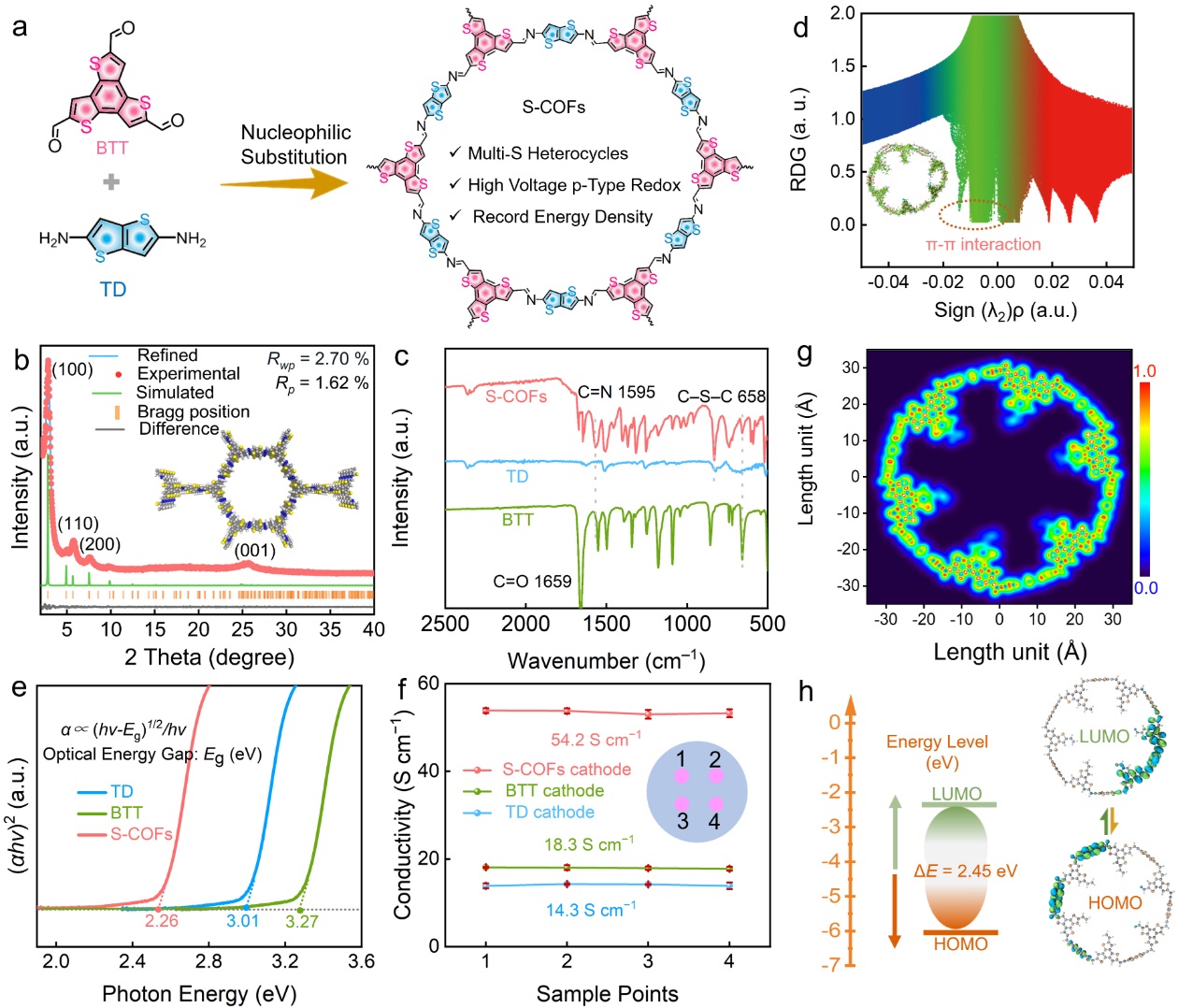 实验表征和理论计算表明,二噻吩和三噻吩单元结构通过胺醛缩合反应形成S-COFs,展示出高密度多硫氧化还原活性中心和低能垒杂环电子离域路径,有助于加快电子转移动力学和电极氧化还原速率。