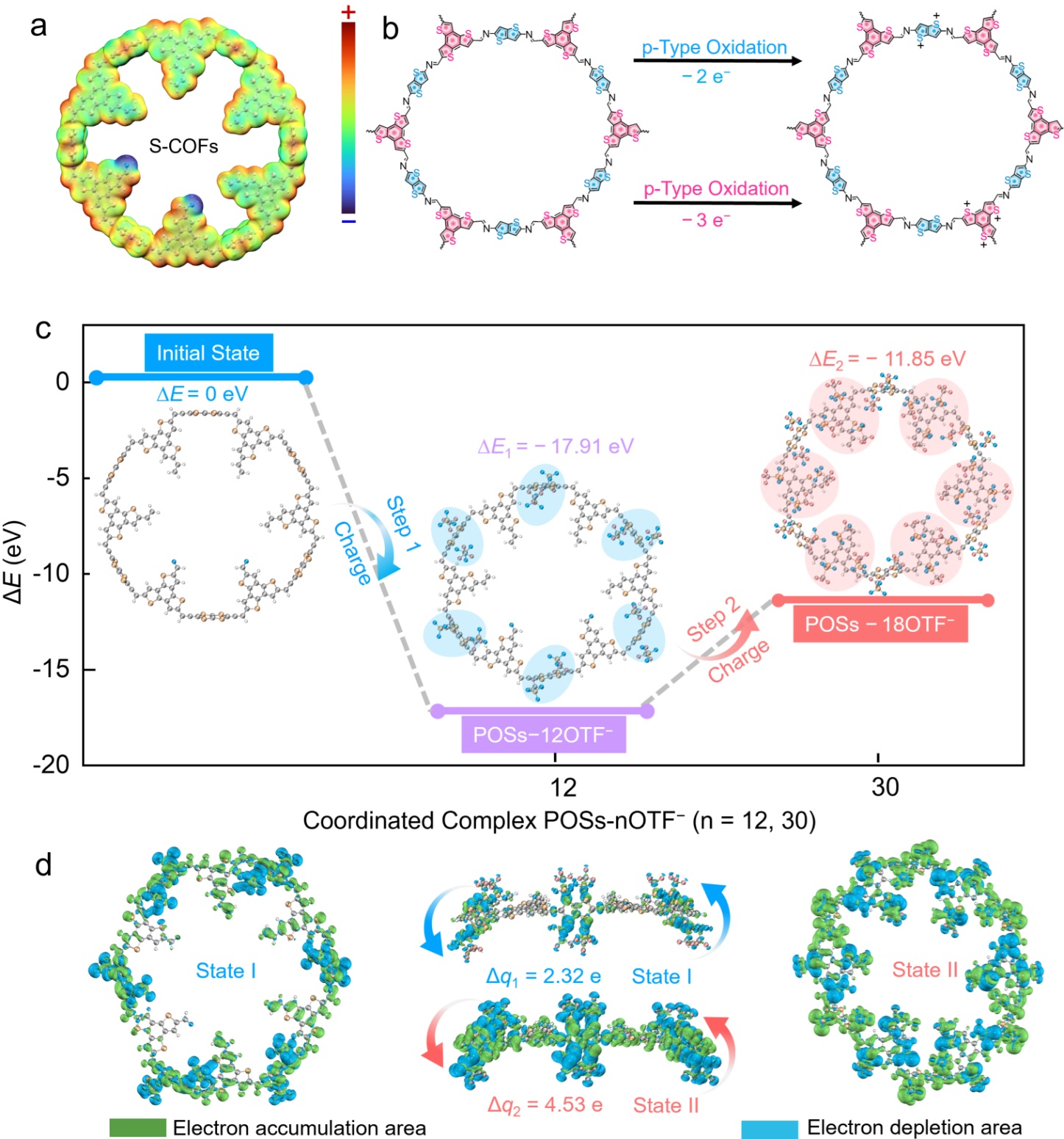 理论计算表明,S-COFs正极与CF3SO3−阴离子间存在强相互作用,稳定的两步30 e−阴离子共配位促进电极/电解质界面电荷累积,显著提高了电荷存储容量。