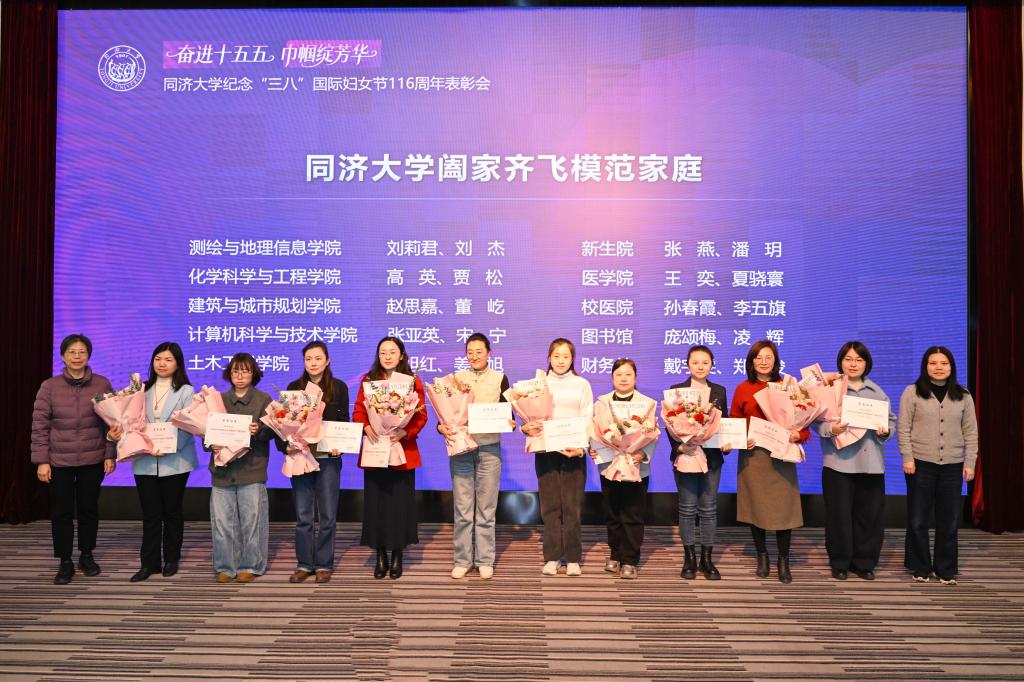 大会为先进个人和集体颁奖。同济大学国家海底科学观测系统项目办公室杨群慧教授荣获上海市三八红旗手标兵提名奖;建筑与城市规划学院杨春侠、耿慧志教授家庭被评为上海市教育系统第四届最美家庭(比翼双飞模范佳侣标兵);建筑与城市规划学院张晓春、李翔宁教授被评为上海市教育系统第十五届比翼双飞模范佳侣;人文学院朱静宇、栾梅健教授荣获上海市教育系统第十五届比翼双飞模范佳侣提名奖;冯甜甜等15位女教师被评为同济大学三八红旗手;材料科学与工程学院电化学储能材料与器件团队等8个集体被评为同济大学三八红旗集体;刘莉君、刘杰家庭等10个家庭被评为同济大学阖家齐飞模范家庭。