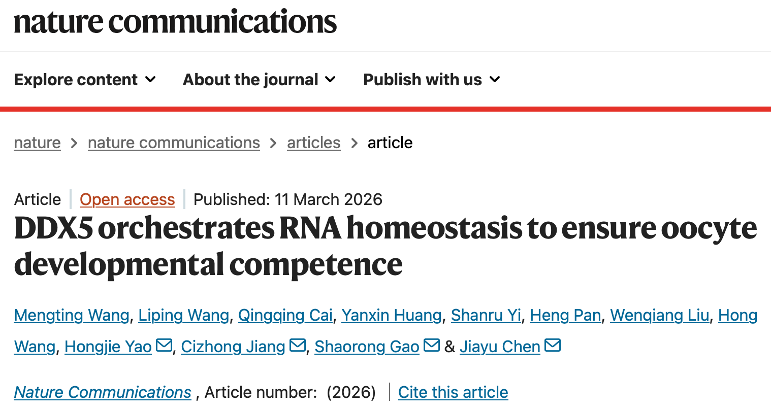 近日,同济大学生命科学与技术学院高绍荣/陈嘉瑜/江赐忠团队联合广州实验室姚红杰团队在《自然·通讯》(Nature Communications)在线发表题为“DDX5 orchestrates RNA homeostasis to ensure oocyte developmental competence”的研究论文,首次系统揭示了DDX5在卵母细胞发育过程中协调RNA稳态的分子机制。