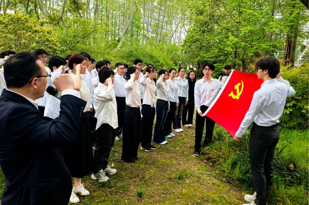仪式伊始,全体师生肃立,向李国豪塑像默哀致敬。仪式庄严肃穆,师生代表共同缅怀老校长严谨求实、锲而不舍的治学态度,开拓进取、勇于创新的科学精神,热爱祖国、奉献社会的崇高品格。新生院负责人表示,此次献花仪式既是对李国豪老校长的深切缅怀,也是国豪书院“弘扬科学家精神”主题教育的重要环节,意义深远。国豪书院自成立以来,始终紧扣国家战略需求,深耕人才培养领域,着力培育能够引领未来的战略科学家。希望国豪学子传承老校长的爱国初心,始终牢记“国豪”二字的分量,心怀家国,坚守使命;传承老校长的治学精神,始终保持求知进取的心态,在专业领域深耕细作、潜心钻研;传承老校长的担当品格,始终保持志气、锐气、勇气,用青春才智、实干担当服务国家发展大局。2023级应用物理学(强基计划)学生李镜瑶作为预备党员代表,以《传承先生风骨,以青春赴家国》为题,讲述了李国豪老校长用毕生心血践行爱国初心与治学追求的事迹。2022级建筑学(精英班)学生何善叔作为毕业生党员代表,以《薪火相传守初心,同心奋进向未来》为题,分享了自己在书院的成长感悟,提出要以主动求学立心、以跨界融通拓界、以代际传承聚力,将老校长的精神品格代代相传。随后,国豪书院的预备党员们面向党旗庄严宣誓,铿锵誓言彰显着青年党员听党指挥、奋勇争先的坚定信念。学生代表敬献花篮。全体师生逐一缓步绕像瞻仰,献上手中鲜花,表达对老校长的追思与敬意。
