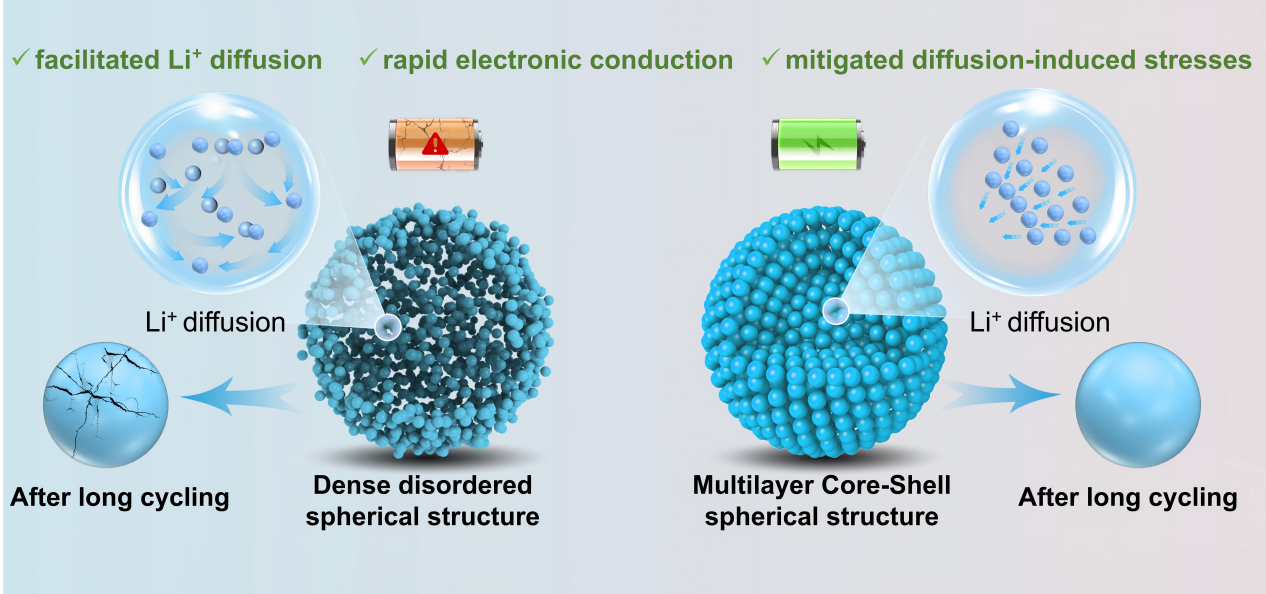 研究团队利用热力学中的熵增疏水效应,驱动前驱体自组装调控材料微观生长,构建出具有有序梯度层间通道的多层核壳结构。这种特殊的几何构型在材料内部形成纳米级“应变缓冲带”,既能有效容纳晶格膨胀,实现内部应力均质化,又能构建锂离子传输的高速通道。