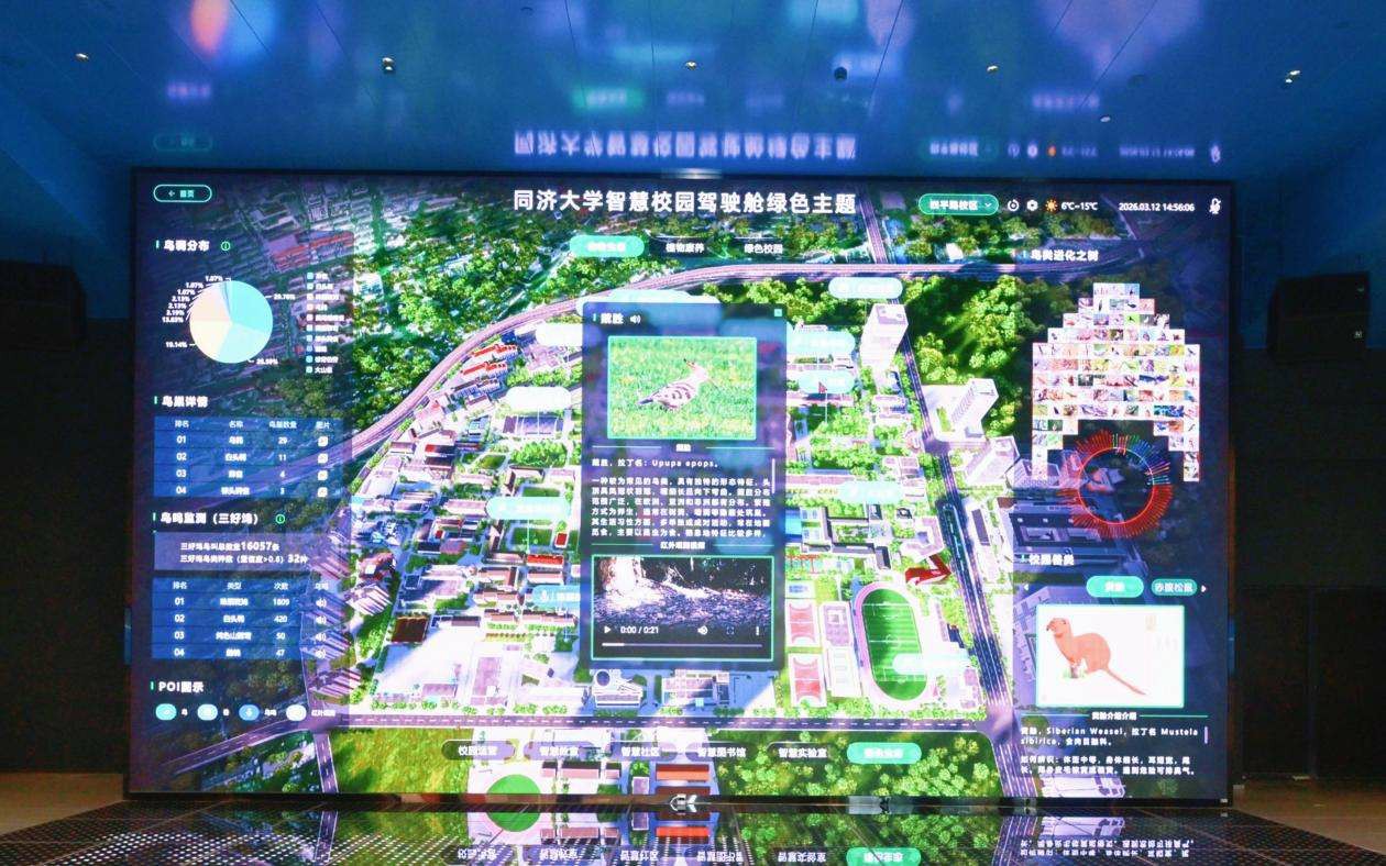 步入驾驶舱,一张动态的校园时空地图正实时更新。不同种类鸟儿的栖息轨迹、各类小动物的分布版图、每棵树木的生长态势……经过十余年的调查积累,学校通过视频监测、声纹监测等多元数据采集方式,将校园里350余种陆上生物的生存状况信息整合汇聚在校园地图上,并量身定制相应的保护措施。同时,依托三维建模与实时物联数据,系统精准监测如四平路校区3278棵树木的固碳量,以及220栋建筑的能耗情况。这些数据不仅为能源优化提供科学导航,更在生物多样性保护中发挥关键作用,让绿色发展理念借助科技力量落地生根,构筑师生与自然和谐共生的美丽校园。
