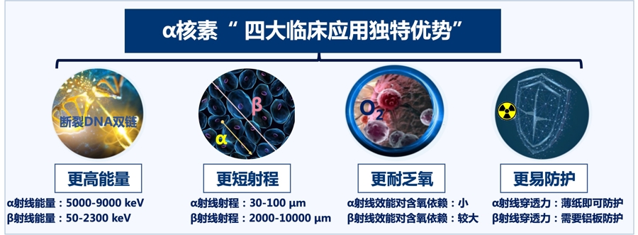 《标准》的主要制定者,同济大学核医学研究所所长余飞教授介绍,阿尔法核素药物因具备“更强能量、更短射程、更耐乏氧、更易防护”四大临床应用独特优势,已成为核素治疗肿瘤的“未来蓝海”。
