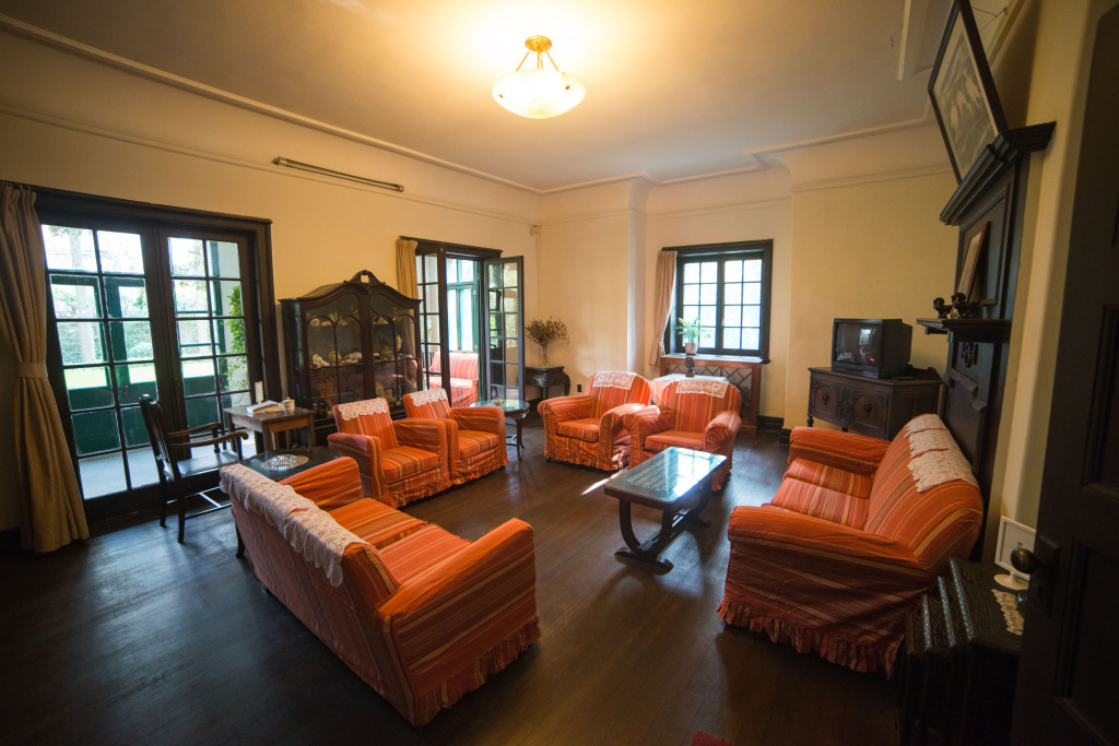 爱好阅读的柯灵把客厅变成了一个大书房。鲁迅故居所在的新式里弄住宅共有三层,独立进出,南向入口后有一个不到10平方米的小庭院,底楼客厅为南北向,有些昏暗冗长,前区为会客区,后侧为用餐区,中间用装饰玻璃落地门隔开。会客区被一套6人木质餐桌椅所替代,餐桌前方靠墙是一张木质写字桌,为鲁迅好友瞿秋白之遗物,依次靠墙摆放了玻璃书柜、缝纫机、留声机、西式碗橱等生活器物,用餐区中央为一张小方桌配四把椅子,靠走廊的侧墙还摆放了带镜面的民国洗漱架。